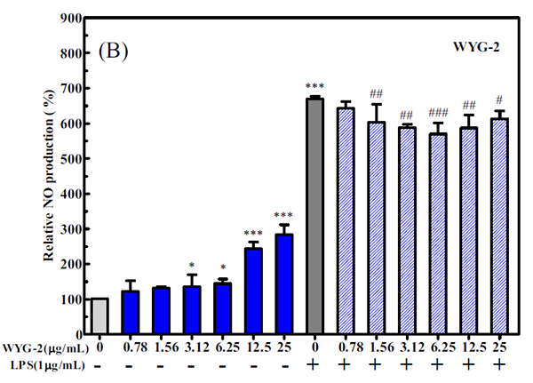 All the five WYG components significantly stimulate NO production in a dose-dependent mode, suggesting that they have significant immunomodulatory activities. And the five WYG components show different immunomodulatory effects in macrophages with or without LPS, suggesting that they may have two-way immunomodulatory effects in macrophages, among which WYG-2 has the highest two-way immunomodulatory activity.