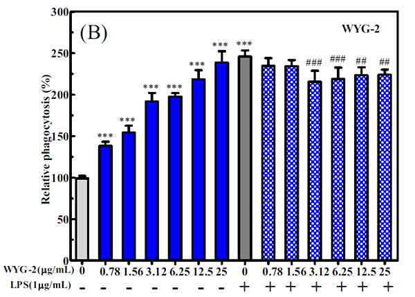All the five WYG components can improve the phagocytosis activity of macrophages. And all the five kinds of WYGs can reduce the activity of LPS pretreated macrophages, showing a positive two-way regulation relation, among which WYG-2 has the best inhibitory effect.