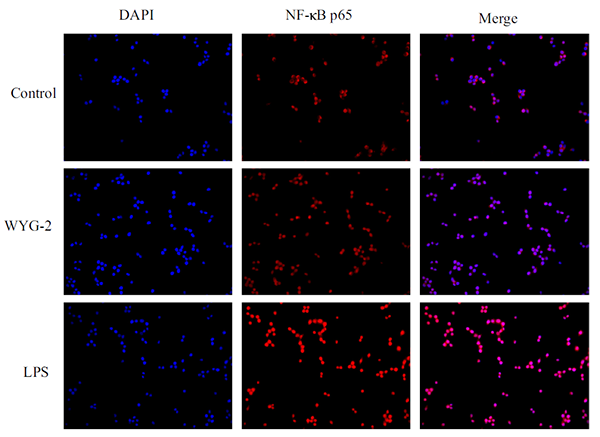 Macrophage nucleus and NF-κB p65 protein have been stained, and the effect of WYG-2 on NF-κB p65 protein translocation has been studied by immunofluorescence. Nuclear translocation of the p65 protein has been observed in treatment with WYG-2 and LPS alone. All the results indicate that WYG-2 can activate macrophages through MAPK and NF-κB signaling pathways.