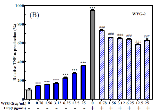 WYG can stimulate macrophages to secrete cytokines TNF-α, IL-1β and IL-6, while after LPS treatment, WYG will inhibit the productions of cytokines TNF-α, IL-1β and IL-6.