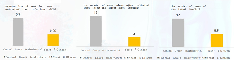 In 2022, Angel Yeast conducted a double-blind, randomized, controlled study on yeast β-glucan for upper respiratory tract problems in Australia. During the 3-month experimental period, it was found that taking 200mg of yeast β-glucan daily for 12 weeks helped reduce the severity of sore throat and improved sleep quality in participants with colds. Additionally, the study showed that yeast β-Glucan shortened recovery time, with the β-Glucan group requiring only 0.3 days of rest, compared to 0.7 days for the placebo group.