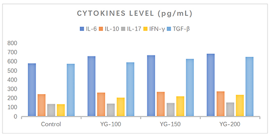 We have conducted in vivo studies in mice of β-glucan in yeast and evaluate the changes in their cytokine levels. Yeast β-glucan stimulated the expression of IL-6, IL-17, IFN-γ, IL-10, and TGF-β effectively (Figure 1). This study reveals that yeast β-glucan is a potent immune activator and enhancer of the host’s antioxidant capacity.