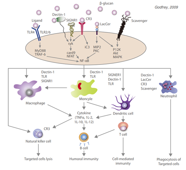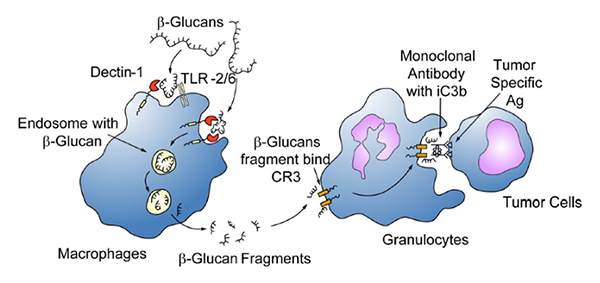 β-glucan is ubiquitously found in both bacteria or fungal cell walls and is connected with have been implicated in the initiation of anti-microbial immune response. β-glucan acts on several immune receptors including DECTIN-1, complement receptors (CR3) and Toll-like receptors (TLR-216) and trigger a group of immune cells including macrophages, neutrophils, monocytes, natural killer cell and dendritic cells. Low dosage of β-glucan can keep the immune system alert and making the host quickly react to invasive organism.