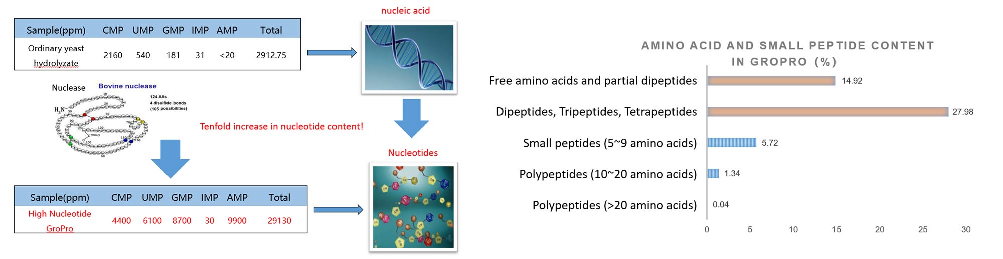 Hydrolyzed yeast is also rich in flavor compounds that animals like, such as flavor nucleotides (IMP+GMP) and peptides (Gly-Gly, Gly-His-Gly, Gly-Gly-His etc.) and amino acids. Lot of studies found that GroPro has almost same palatability with some other functional proteins such as SDPP or fish meal depending on laboratory as well as animal experiments.