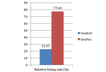 GroPro increased relative biting rate significantly in Carassius Auratus Gibeli. The relative biting rate of control group was 22. 37% compared with 77. 63% of GroPro, the difference was 55. 26%. (Figure 3)