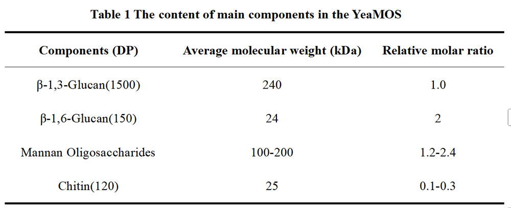 The active components of yeast cell wall are mainly composed of β-Glucan, MOS, glycoprotein and chitin. The content of main components in the YeaMOS (Table 1).