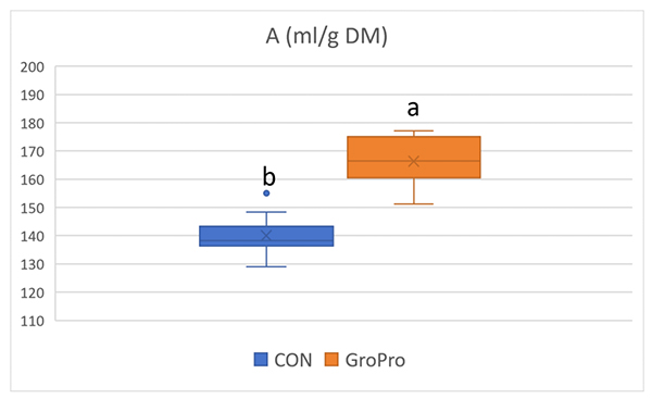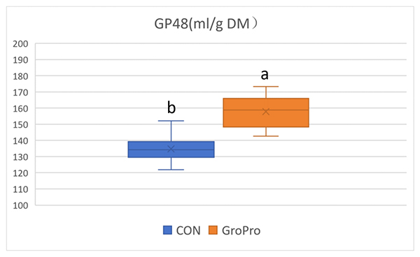 Using high-yield dairy cow TMR feed (CP =16.16%, NDF=35.47%, ADF=20.12%) as fermentation substrate, 5kg/ tons of GroPro was added to cow concentrate feed, and the control group was set up for rumen fermentation in vitro. The results showed that compared with the control group, the addition of GroPro improved rumen fermentation in vitro, and significantly increased in vitro fermentation gas production and aerodynamic parameters such as IVDMD, GP48 and so on.