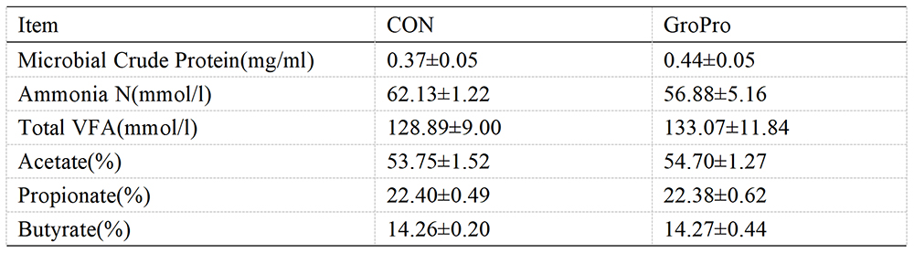 The addition of GroPro increased the contents of microbial crude protein, propionic acid and total VFA in rumen fermentation broth.