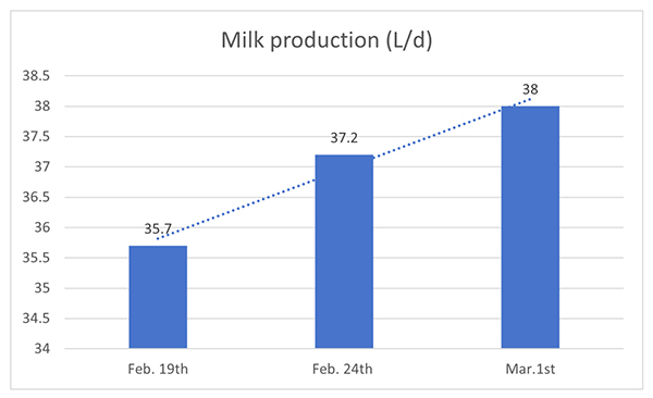 One hundred and twenty Holstein cows with high yield were selected in the experiment. The addition amount of GroPro was 10g / head / day (added by TMR diet). The experiment lasted for 20 days. The results showed that the average milk yield of dairy cows increased continuously after using GroPro, and the milk yield increased by 1.5L on the 5th day and 2.3L on the 20th day.