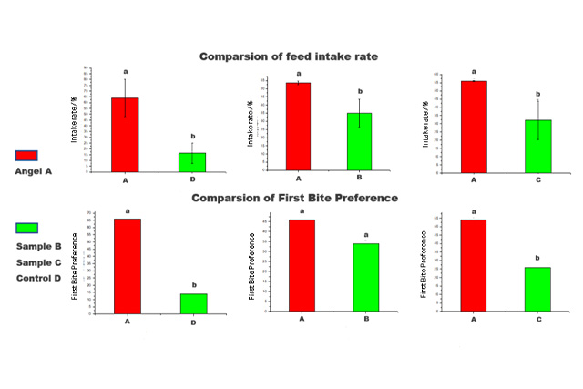 The results of animal trials showed that the dog food with Angel A added has the better performance on the first bite preference and feed intake rate of palatability enhancer than that with sample B and sample C, indicating that palatability enhancer Angel A had a better effect on improving the flavor of dog food. And food intake rate and first bite preference of palatability enhancer Angel A were significantly higher than those of the Control D, indicating that palatability enhancer with meaty and roasted aromas could significantly improve the palatability of dog food.