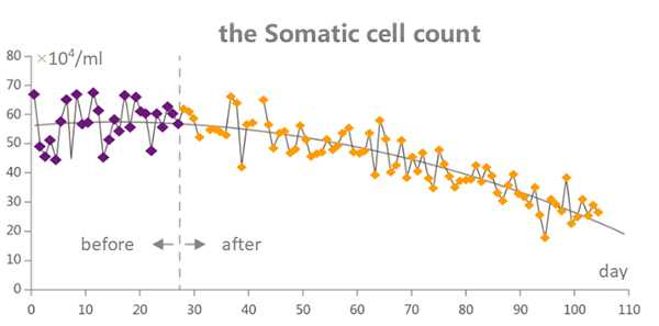 The above test results showed that when 300g/t yeast selenium (YeaSel 2000ppm, Angel Yeast) was added to the concentrate supplement, the number of somatic cell counts decreased significantly by 58.85% after 80 days, indicating that yeast selenium can effectively prevent mastitis.