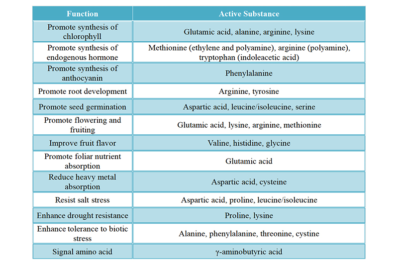 In addition to dozens of conventional amino acids, there is also γ-aminobutyric acid in the composition of yeast-derived amino acids. γ-aminobutyric acid is also a signal substance, which can regulate osmotic potential, pH value and carbon-nitrogen balance of plant cells, and improve the ability of plants to resist stress. γ-aminobutyric acid can also be used as a regulatory ligand of glutamic acid to regulate nitrogen metabolism in plants and promote crop growth. The types and efficacy of amino acids in yeast glycoside are shown in Fig. 3 and Table 3.