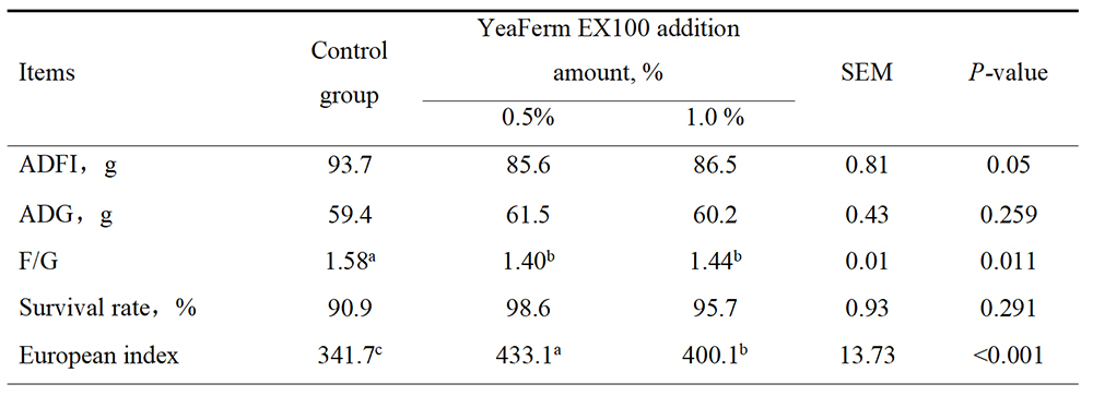 In a study with Cobbe broilers fed a diet supplemented with 0.5% and 1% YeaFerm EX100 over 42 days, results showed a significant reduction in feed-to-gain ratio (F/G) and an increase in the European performance index. Additionally, the average daily gain (ADG) in the 0.5% and 1% YeaFerm EX100 groups was increased by 2.1g and 0.8g, respectively.