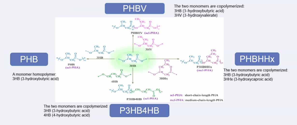 At present, a total of four types of PHA have been industrialization, including polyhydroxybutyrate (PHB), 3-hydroxybutyrate 3-hydroxyvalerate copolyester (PHBV), 3-hydroxybutyrate 3-hydroxycaproate copolyester (PHBHHx) and 3-hydroxybutyrate 4-hydroxybutyrate copolyester (P34HB), etc., which have their own advantages in practical applications.