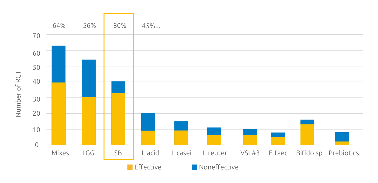 Among the results of meta-analysis of 273 clinical trials for various probiotics, S-boulardii is in the top 3 clinical trials, the success rate of clinical trials of other probiotics is around 50%, while S-boulardii has a high success rate of 80%.