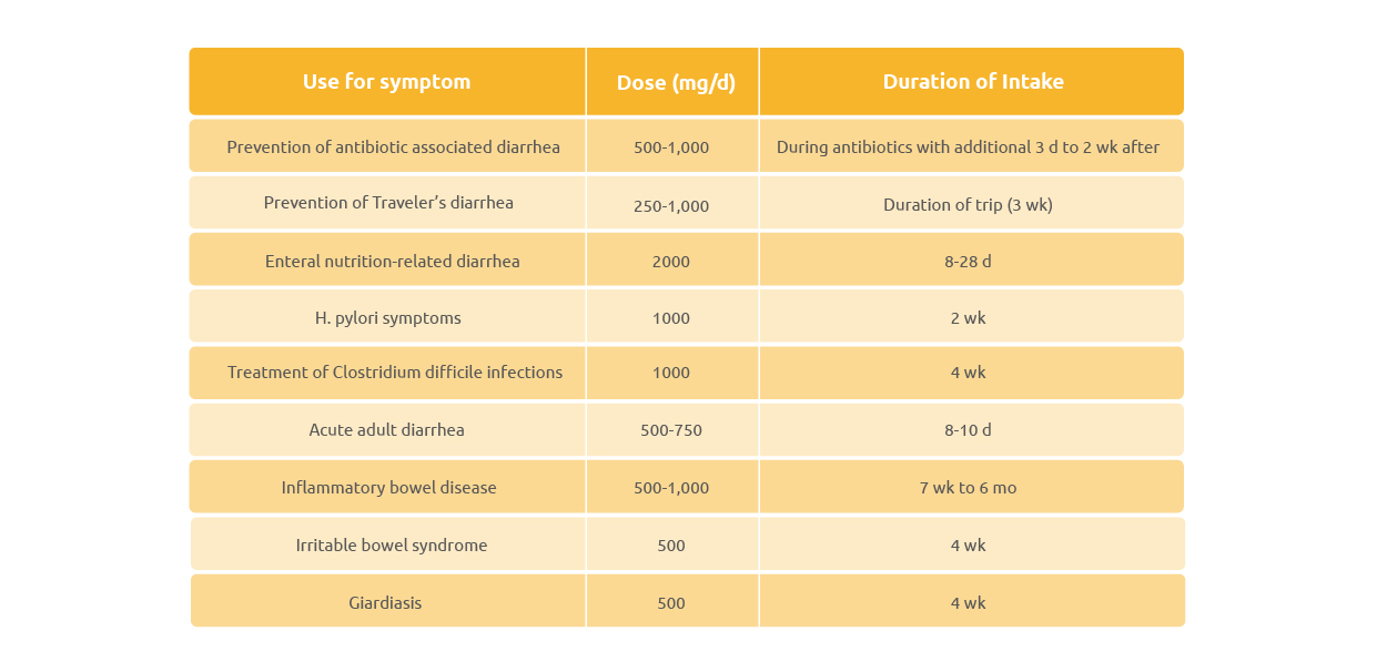 S-boulardii can be easily applied in capsules, sticks or sachet. General daily dosage is 250 mg (equivalent to 5 billion colony-forming units per gram) to be taken while travelling or when starting the antibiotic treatment and continuing for a few days after antibiotics are stopped.
