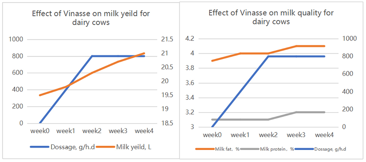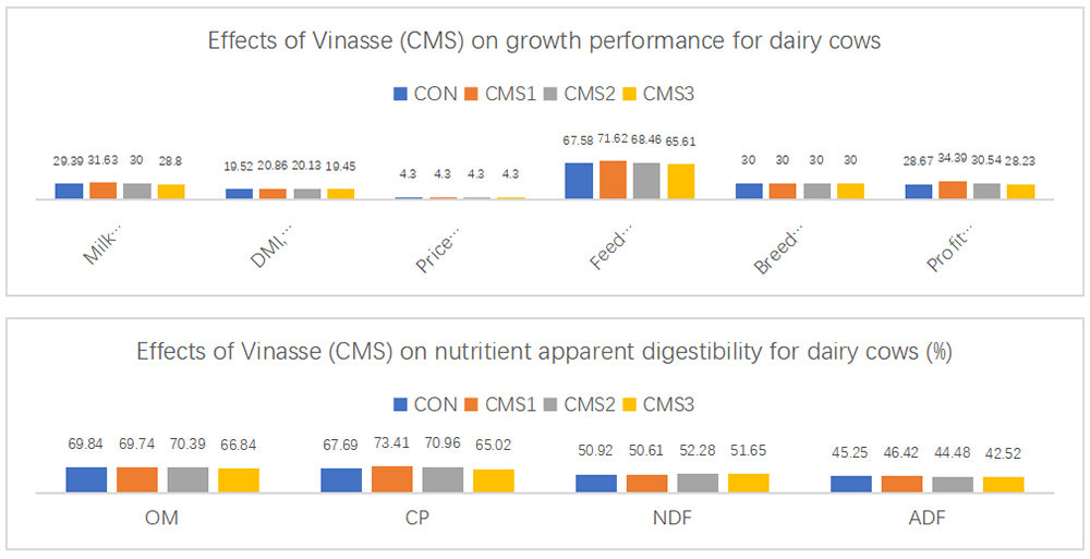 Some report showed that 1% and 3% Vinasse in dairy cows TMR can improve the performance, improve the digestibility of OM and CP, improve economic benefits, and promote the synthesis of MCP in the rumen (p<0.05).