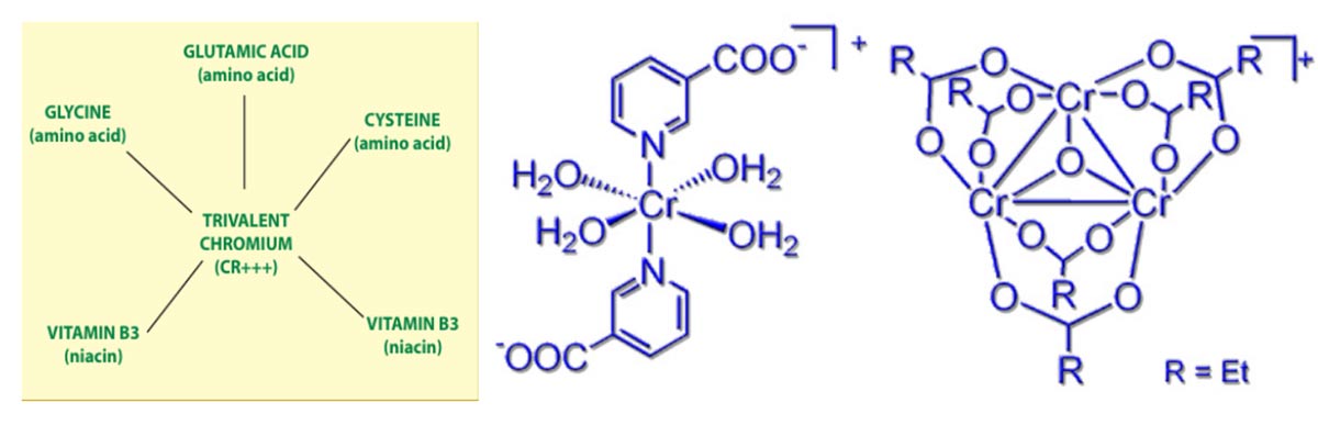 Note: [Cr(nicotinate)2(OH2)4)]+ as a structural model for the glucose tolerance factor; [Cr3O(propionate)6(OH2)3]+ as a functional model for chromodulin