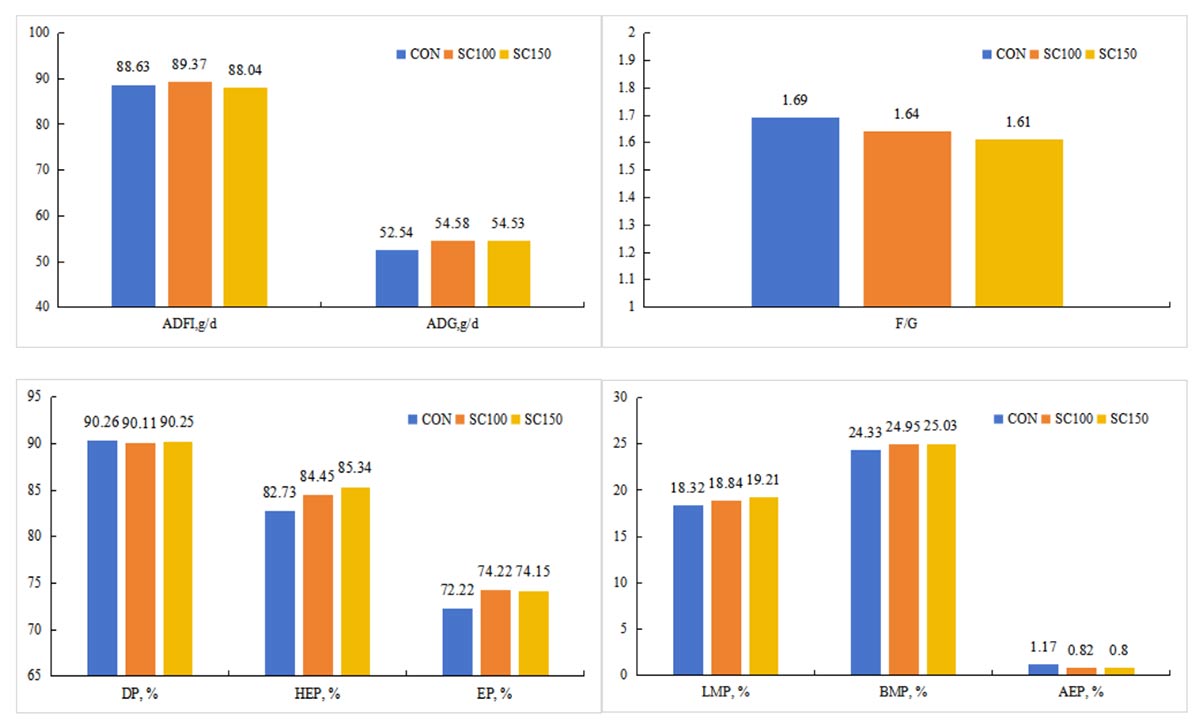 The result is shown in the figure. Compared with 15 g/t Na2SeO3 group(CON), the Yeast Selenium and Chromium at a dose of 100g/t or 150g/t can to some extent increase by 3.8% the average daily weight gain(ADG) of broilers, reduce 0.05-0.08 of the feed-to-meat ratio(F/G), and have no significant effect on average daily feed intake(ADFI).