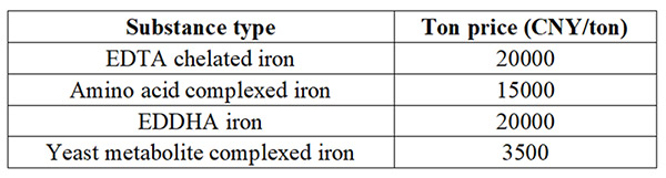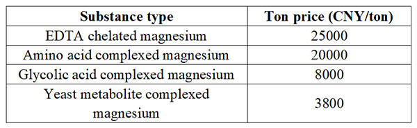 As can be seen from Table 3 and Table 4, the cost advantage of yeast metabolite magnesium or yeast metabolite iron is very obvious, and the cost per ton is 17.5%-50% of the cost of other organic state trace element raw materials.