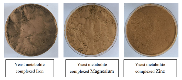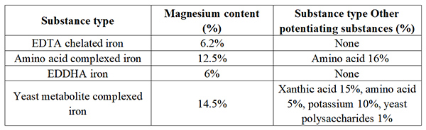 As can be seen in Tables 1 and 2, the yeast metabolite magnesium or yeast metabolite iron of magnesium/iron content, are significantly higher than other organic trace elements products, and other synergistic substances composition and quantity are also more abundant.