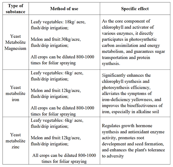 Yeast metabolite is not a synthetic product, but a collection of active substances naturally secreted by edible yeast in the process of fermentation, which contains: more than 40% small molecule xanthohumic acid with molecular weight in the range of 800 Da; more than 10% 16 kinds of free amino acids; more than 5% free amino acids; more than 5% free amino acids; more than 5% free amino acids; more than 5% free amino acids; more than 10% free amino acids. Free amino acids; 5% or more of yeast polysaccharides that can activate plant disease resistance system; 5% or more of organic acids such as citric acid, succinic acid and other organic acids; in addition, there are nucleotides, vitamins, niacinamide and other growth factors required for plant growth.