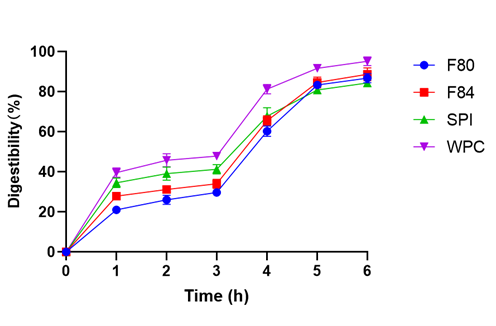 The digestion process primarily takes place in the intestinal fluid. During the intestinal tract digestion phase, the digestibility of all proteins steadily increased. The digestion curves of F80, F84, and SPI nearly overlapped, gradually reaching the digestion endpoint after about 5 hours, with a final digestibility of approximately 85%.
